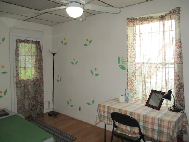 The 1st-floor bedroom has a queen bed, decent closet, table, and chair, separated from the corridor by the partition wall. The private full bathroom is in the basement.
